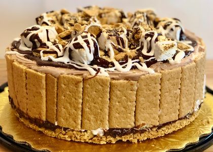 Graham cracker crust...two layers of twist ice cream with hot fudge, marshmallow & graham crackers in between layers. It has graham crackers around the outside with hot fudge, marshmallow creme & homemade marshmallow on top.