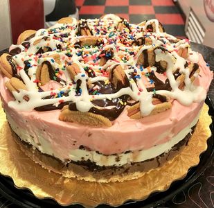 Vanilla oreo cookie crust..a layer of chocolate, vanilla & strawberry. Hot fudge and chocolate crunch inbetween layers topped with hot fudge and cookies with rainbow sprinkles.